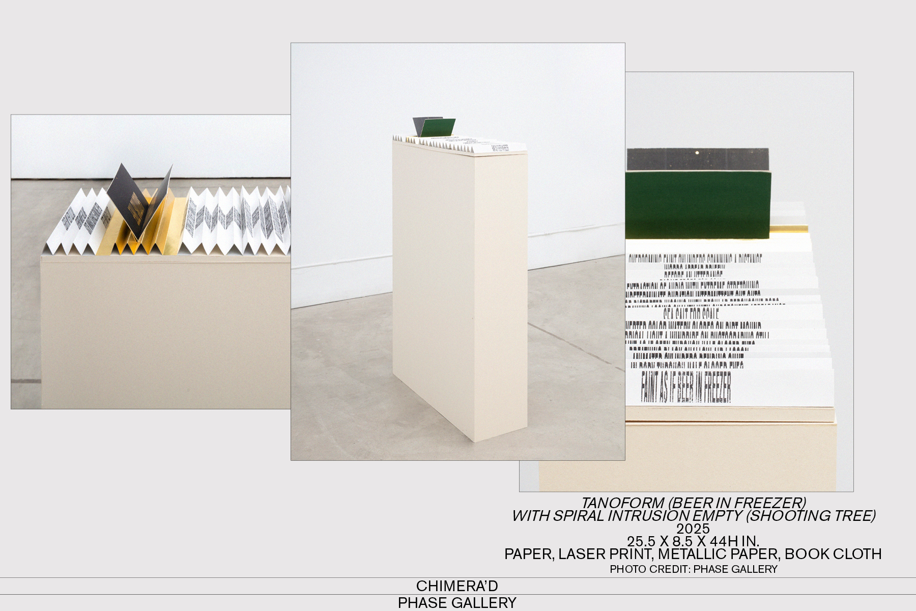 Featuring works by Gabrielle Jennings, Won Ju Lim, Sid M. Duenas, Coffee Kang, Ren Ebel, Kaya & Blank, Benjamin Weissman, Ruoyi Shi, Gabriel Madan, Alexa Almany, and Lena Daly. Curated by Li Zeng & Rueben Merringer. The chimera, a multi-headed creature found in Greek myth, is an actively shifting framework of looking. Aspects of the chimera can be found in nearly everything. Isolate certain details, examine histories and origins of seemingly “singular” objects and concepts, place a thing in a new context or relationship, you can impart in it a sense of transition, ironic interdependency, and hybridity. Two or more seemingly unrelated bodies sheathed in a seamless skin: justice and mercy, capitalistic spirituality, democratically electing a figurehead upon whom is bestowed almost divine rights, inanimate matter conjoined to create replicator molecules of various sorts, capable of resource competition. Then there is the abstract definition: a generally elusive impossibility, or enigma. This exhibition addresses the chimera as an action. To chimera (or chimerize), suggests the coming together of disparate things to create a new unity. But the action could be less physically comprehensible, metaphors of mashup, or stitching, in which the new third thing incorporates yet somehow transcends the character of its constituents, without entirely masking their presence. By invoking action, the chimera’d thing is situated in time, suggesting change, producing forensic qualities that can then be chased backwards, or speculated forwards. Chimeras, mythological or analogical, live lives stemming from their original enmeshment and beyond and backwards. The paradox is the search for an origin point, only to find that the reverse is true: chimeras don’t extend into the past towards an originator, but bifurcate into dendritic deep time. This coupled action, moving backwards to genealogical origin, and an expansive family tree, is a chimera unto itself. Language, ideas, myth, elusive and ultimately subjective truths, couple action with action, in conceptual opposition, the relevance of which depends on the framework in which you are looking, and your purposes in doing so. Look to the future, and perplexity abounds. At the center of this extensive action is the chimera’d present, a focal point between imbricated, expanding infinites. By Reuben Merringer